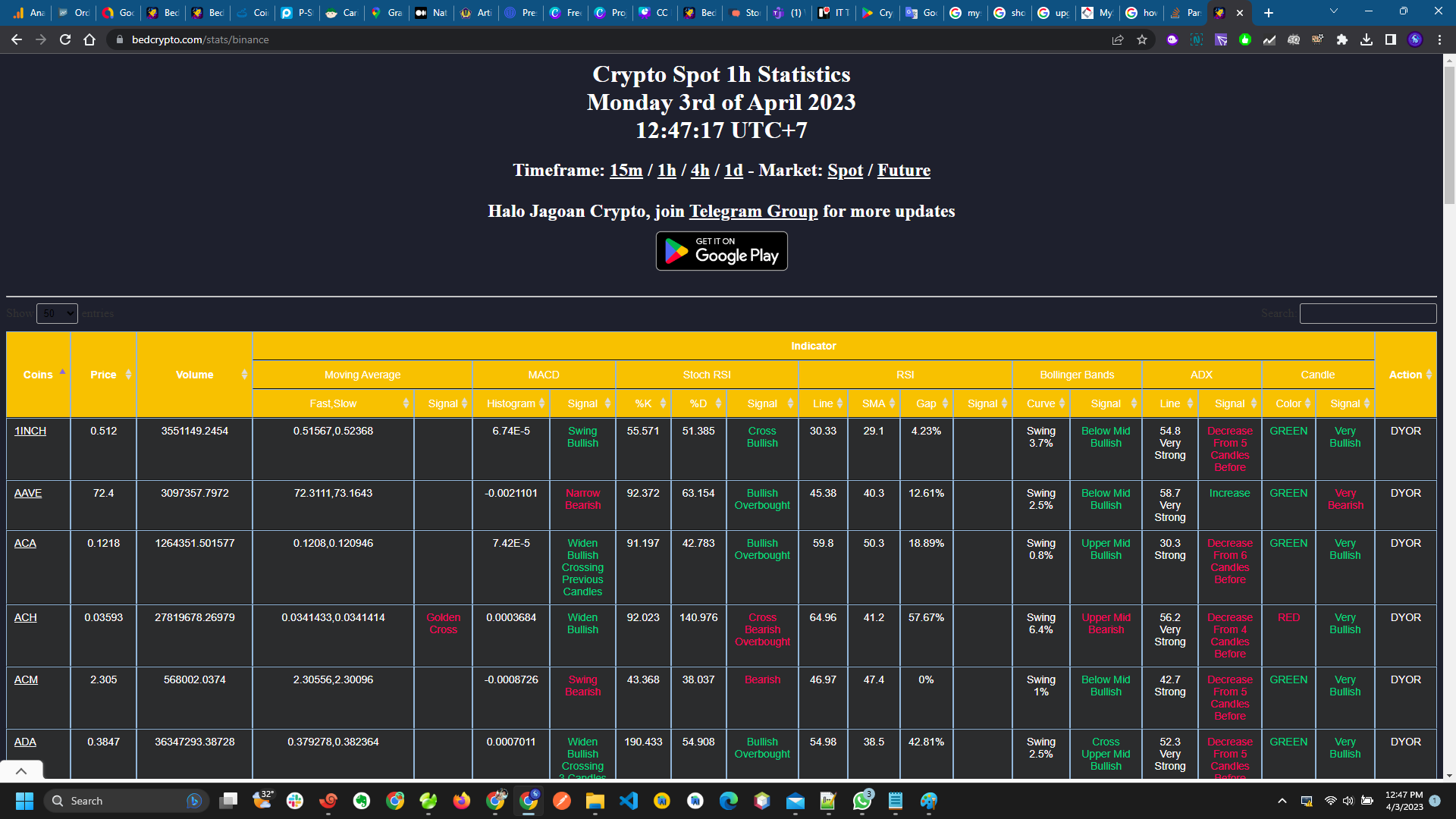View crypto indicator statistics for the spot and futures market, in this feature you must scan using the CC application. This feature is used to view crypto statistics from the spot or futures market, with several main indicators like ADX, RSI, StochRSI, ADX, Bollinger Bands, MACD, Candle Strength.